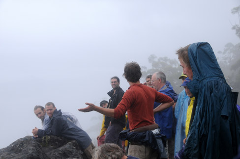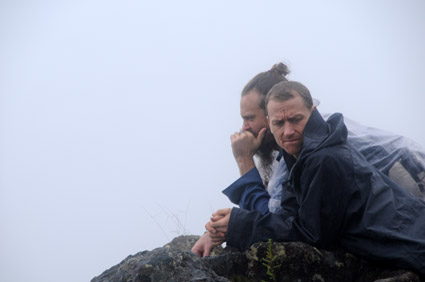 Rain rattles on plastic poncho mud underfoot