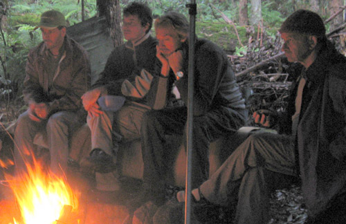 Fire glow reflects on a circle of listening faces